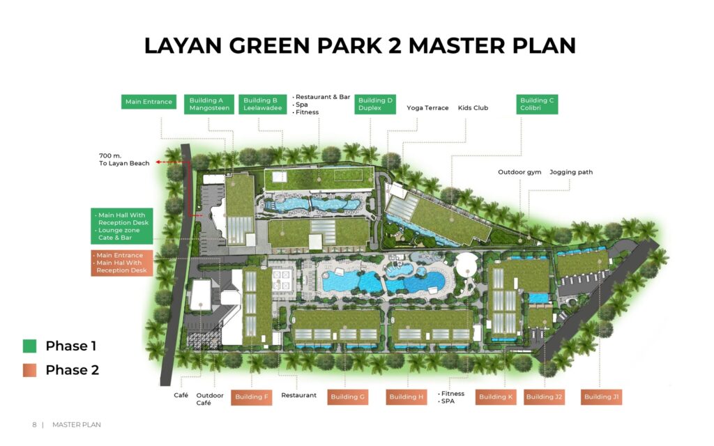 Layan Green Park Phase 2 is located in the Bangtao area of Phuket, only 700 meters from 700 meters from the northern part of Bang Tao beach and 2 kilometers from the Laguna area, golf courses and tennis courts.